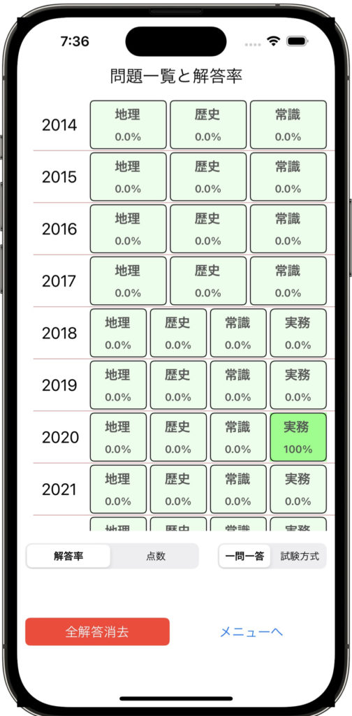 新しい問題選択画面では、解答進捗率と点数が確認できるようになり、ここから各年度の問題へ移動できるようになりました。