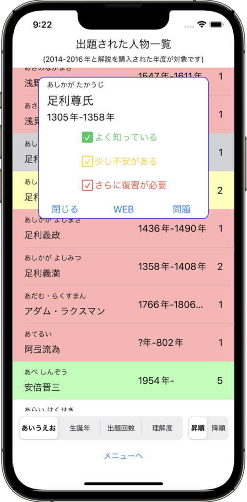 「地図で選択」と「「人物リスト」で、理解度を保存できるように改善しました。